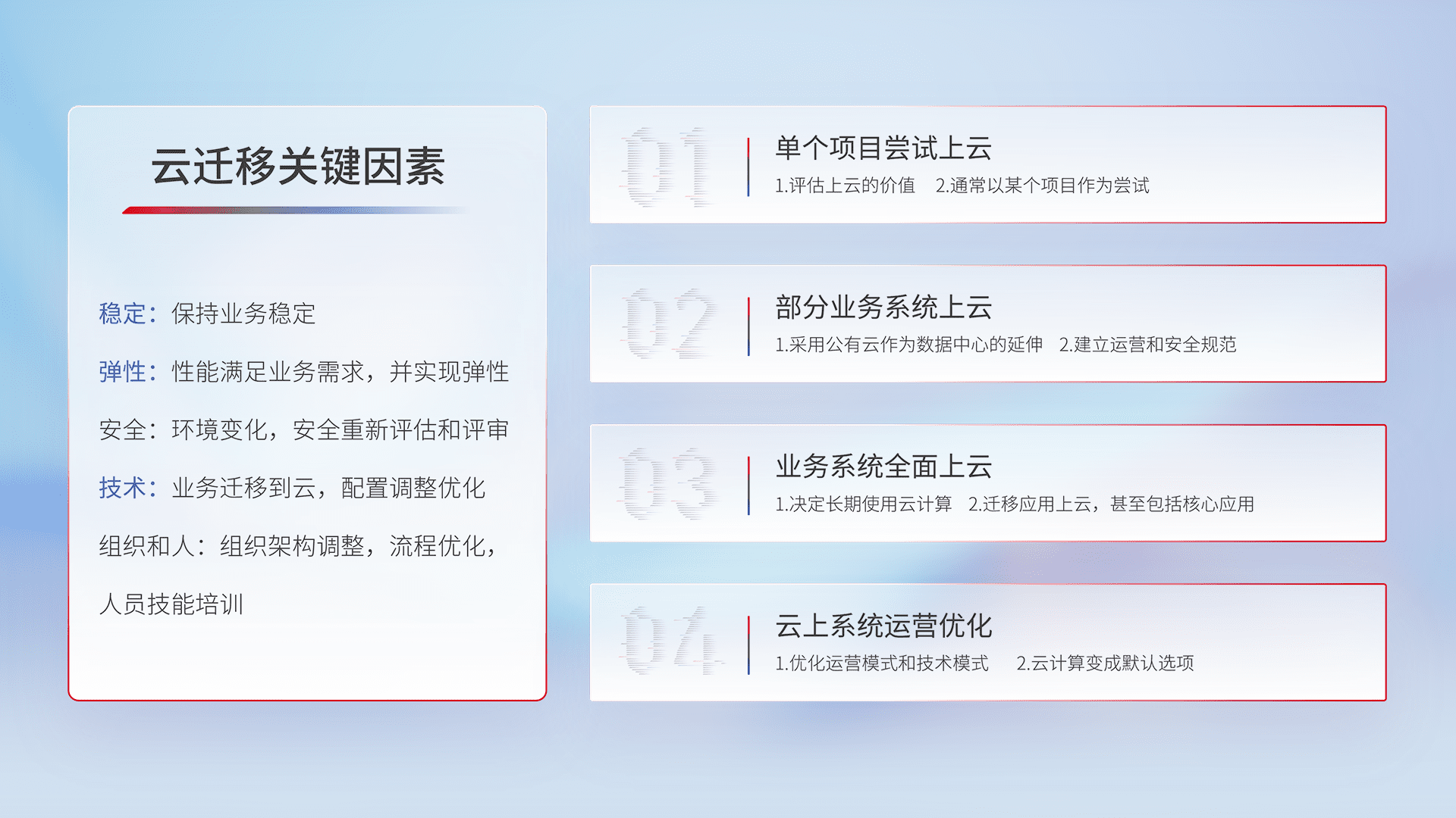 结合实际业务,,从规划设计、、云平台选型、、、、云原生改造、、数据迁移、、、集成交付,,,迁移全过程为客户识别最佳上云路径,,,做好风险识别管理,,,设计网络架构、、身份权限、、安全审计合规、、操作审计、、日志审计、、、监控告警策略、、、多站点容灾设计等,,,,对云上基础设施进行整体规划,,,,提升IT治理水平,,,,以满足弹性、、高可用、、、高性能的需求。。