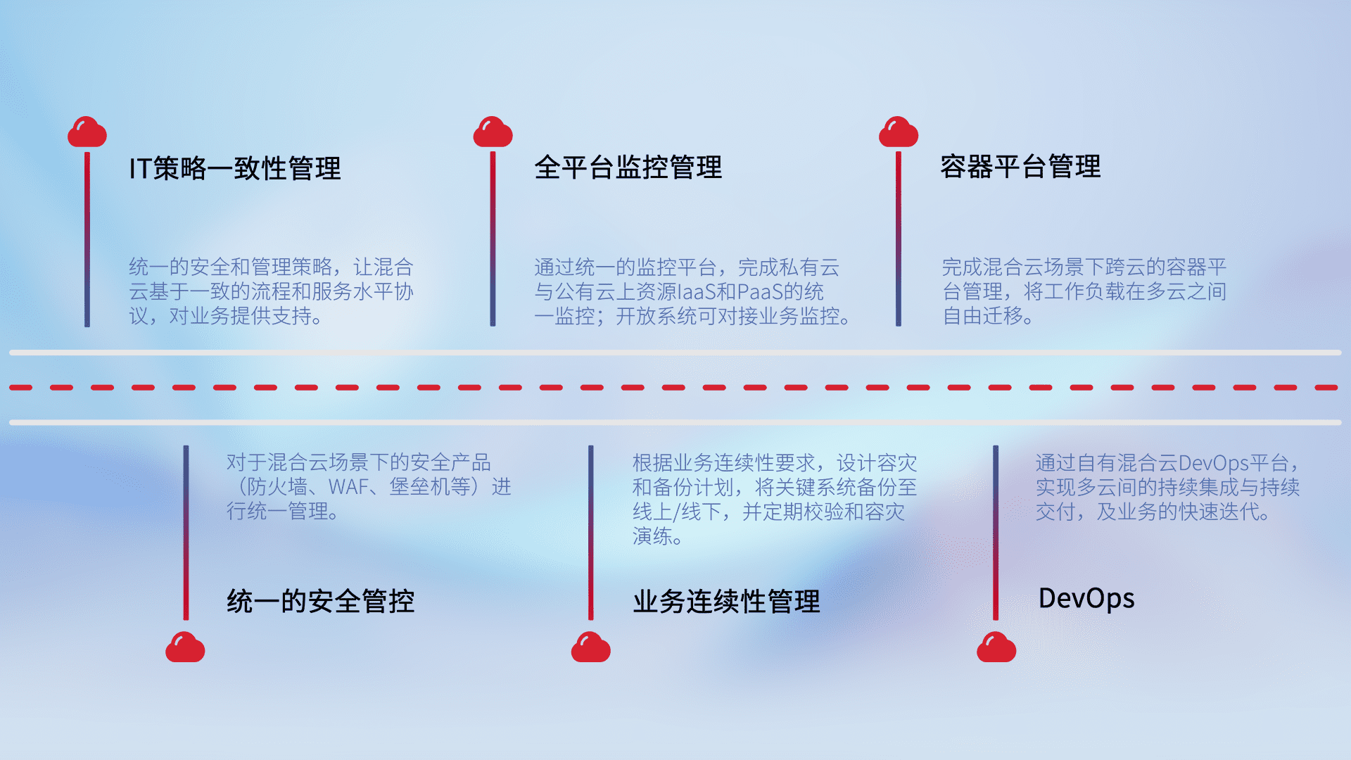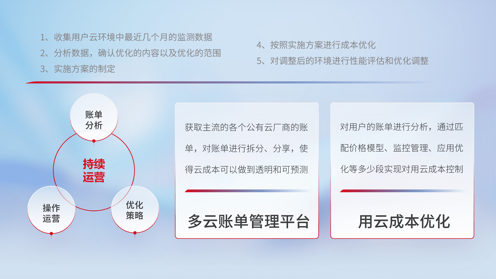通过多云纳管,,,以统一的资源数据模型把客户的云资源进行抽象和封装,,,进而实现对多云资源的统一操作,,,保障云资源管理的可靠性、、、稳定性与可用性。。。量身定制化运维内容,,,,配置、、、开发运维、、补丁管理、、、备份、、、监控、、认证和访问管理、、、审计和日常巡检等,,,保障在用云过程中的可靠度,,,,稳定度以及高可用率。。。。