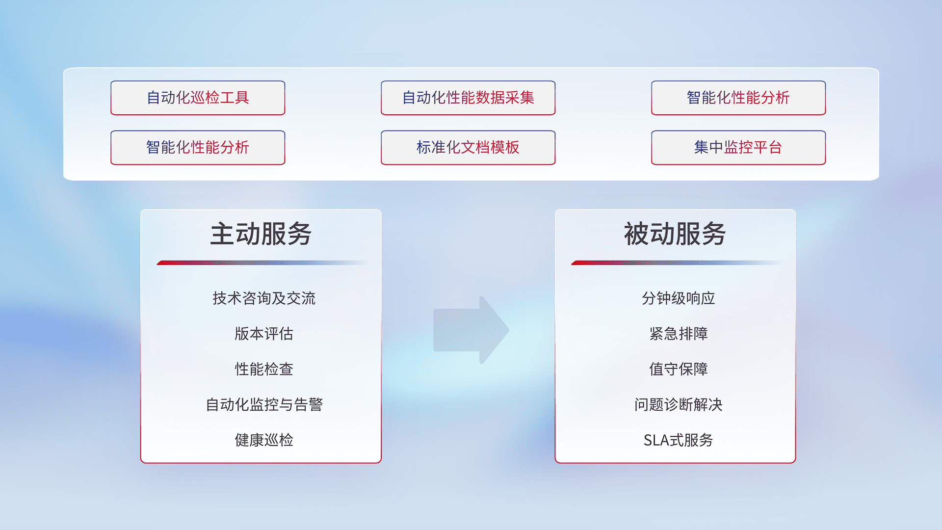智能化工具和标准化文档,,,保障服务质量,,,,提供主动服务(包含技术咨询、、、、版本评估、、、、性能检查、、、、自动化监控与告警、、、、健康巡检)和被动服务包含(分钟级响应、、紧急排障、、、、值守保障、、、、问题诊断解决、、、、SLA服务)。。。。