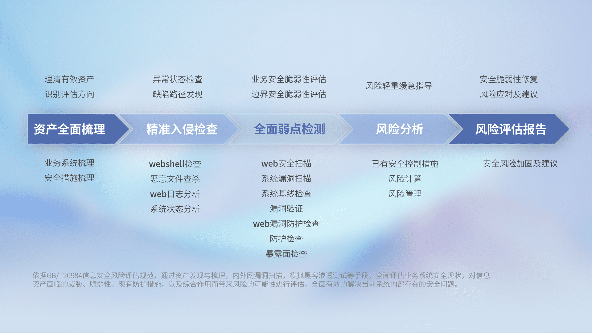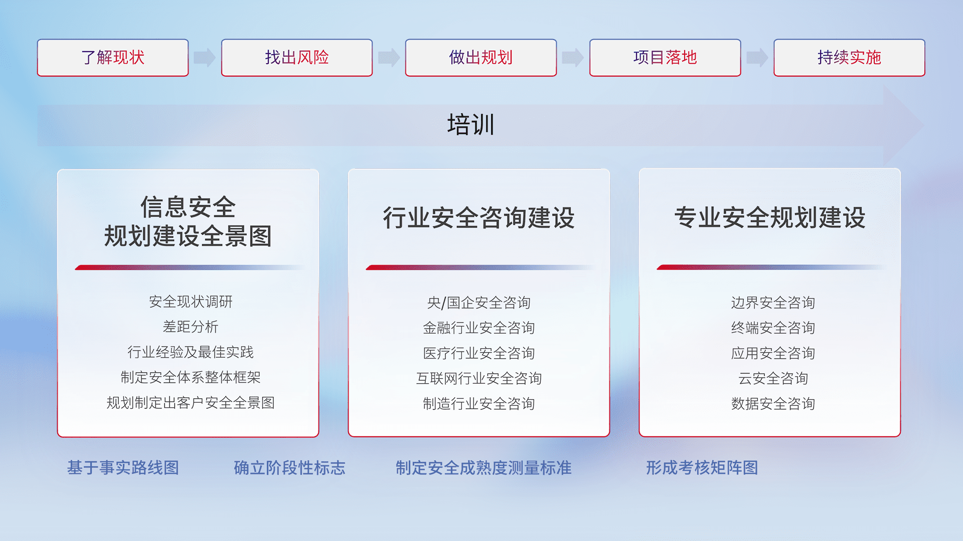 针对客户行业特性,,,以专业的安全服务+多厂商联合解决方案提供专属的一站式安全管理服务,,帮助客户全面感知网络空间威胁,,,,基于识别、、、、检测、、、、分析、、防护、、监测、、响应的服务理论模型,,从方案咨询、、、集成交付、、评估验证、、优化加固、、运维运营,,,,致力于为客户提供完整的闭环管理式安全服务。。以实战经验为客户打造高抵御风险的安全体系,,帮助客户发现威胁、、对抗威胁、、、处置威胁,,,不断积累安全对抗能力,,,,持续保障数字化安全。。