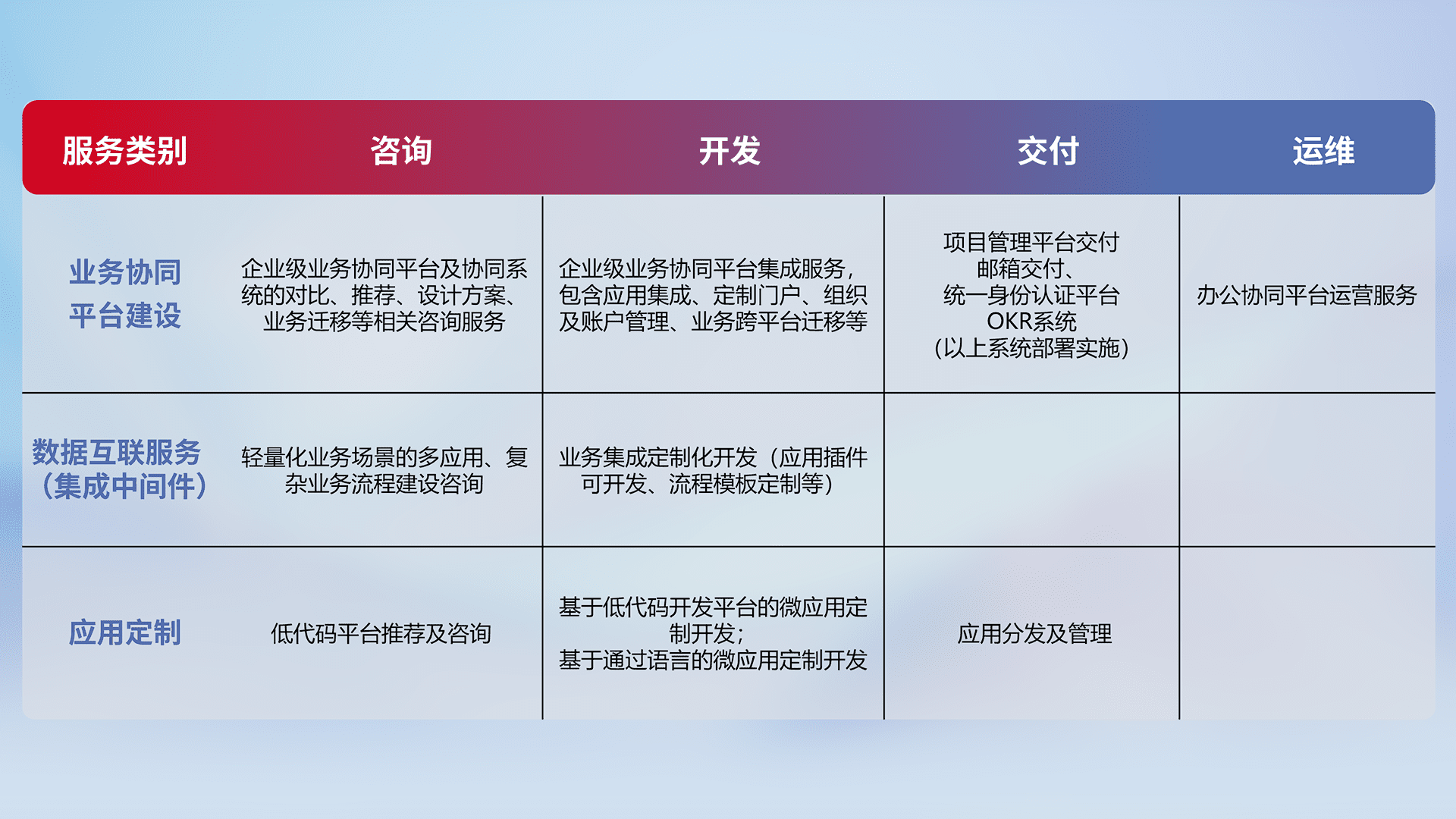 针对钉钉、、企微、、、IDaas等平台级产品提供产品的规划、、方案、、、交付、、、、定制化开发等服务,,,,实现如统一协同办公、、智能客户服务、、混合会议管理、、、智能数据查询、、、等业务场景,,,实现数字化转型。。。